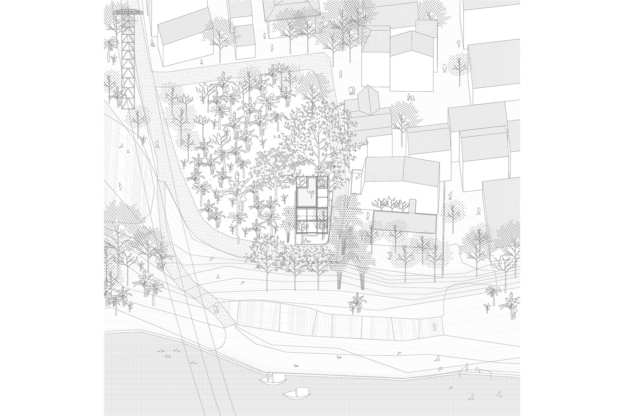 The house is inserted as a resting station in the waterfront and becomes the decoration of the garden. The house presents itself confidently through a system of tight spaces and structure and blends in with the rich soft flora to fully preserve the Genius-loci.