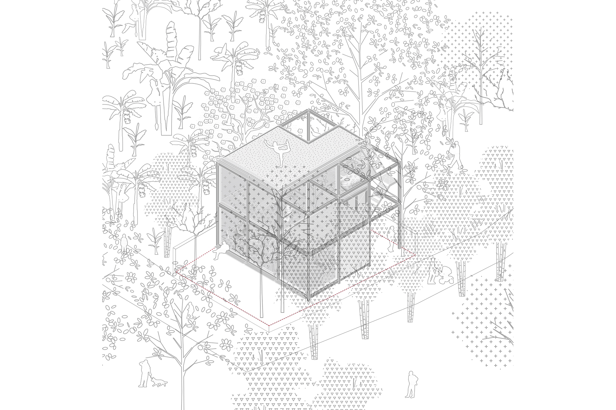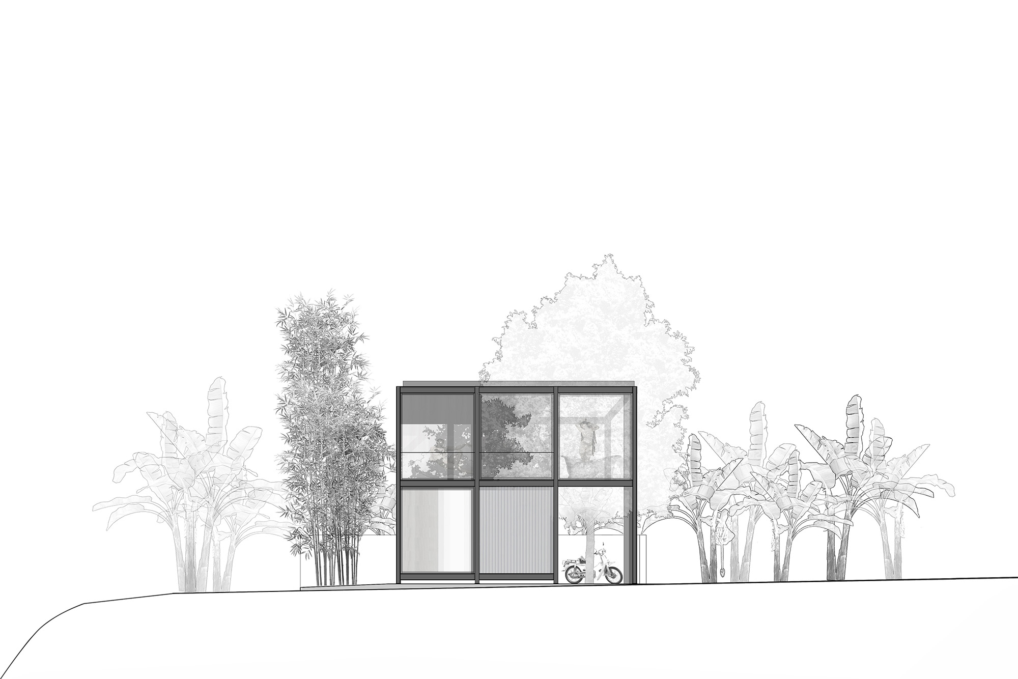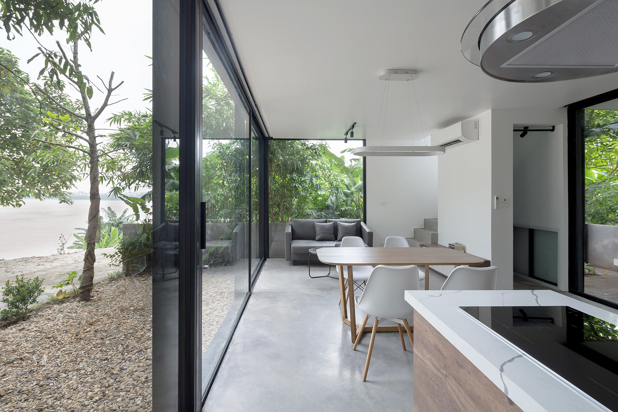 Plants here act as skins for the house and reduce solar radiation. Thanks to the river wind and the free sliding wall system, the house always has optimal air circulation. Layers of overlapping spaces make the house dissolve into nature and become part of this symbiosis. People, nature, air, activities, reflections, images create a transparent space-time.