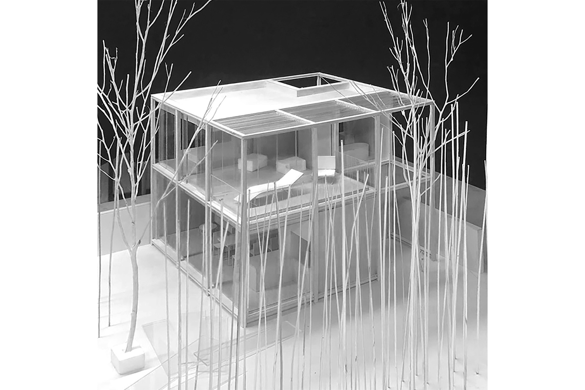 The ancient flora of the North on the site is a characteristic factor, but it is also a disadvantage because of the small site (about 80 qm), but the ancient trees occupy almost all three spatial dimensions. Deciding on a filigree steel structure just like inserting into the shape of trees helps the house to live in symbiosis with large trees but still has all the functions such as a porch in the courtyard, front yard, porch next to the bedroom, the way to the terrace. At the same time, it will protect the glass if the tree branch is knocked down during a storm.
